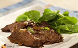2- Acrescente a carne e deixe dourar de todos os lados. Inclua o caldo de carne e sal. Deixe cozinhar até a carne ficar bem macia.